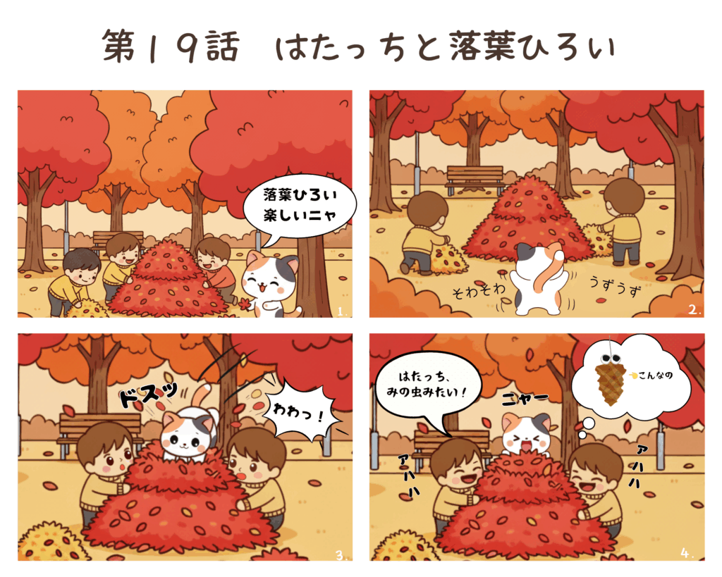はたっちは近所のこどもたちと落葉拾いをして楽しんでいます。