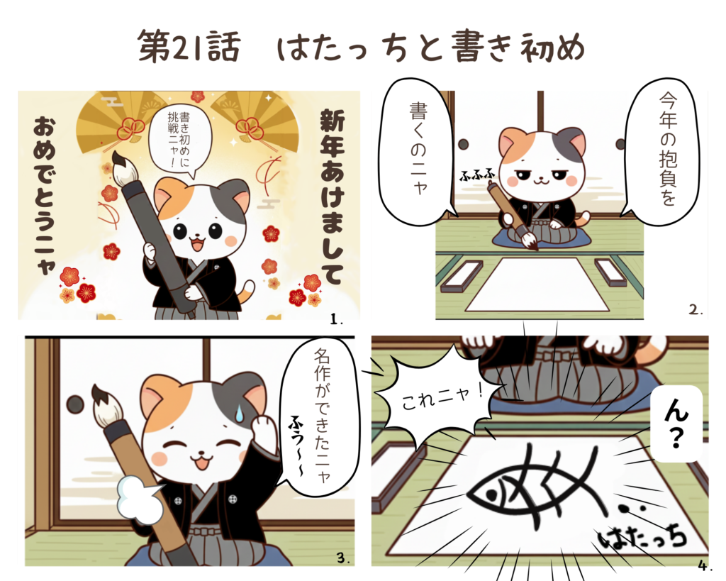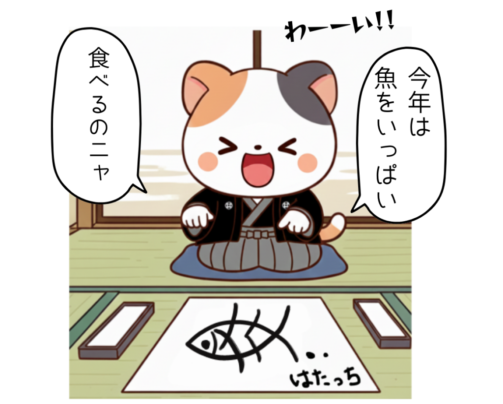 今回のはたっちは、着物を着て書き初めを楽しむはたっちです。